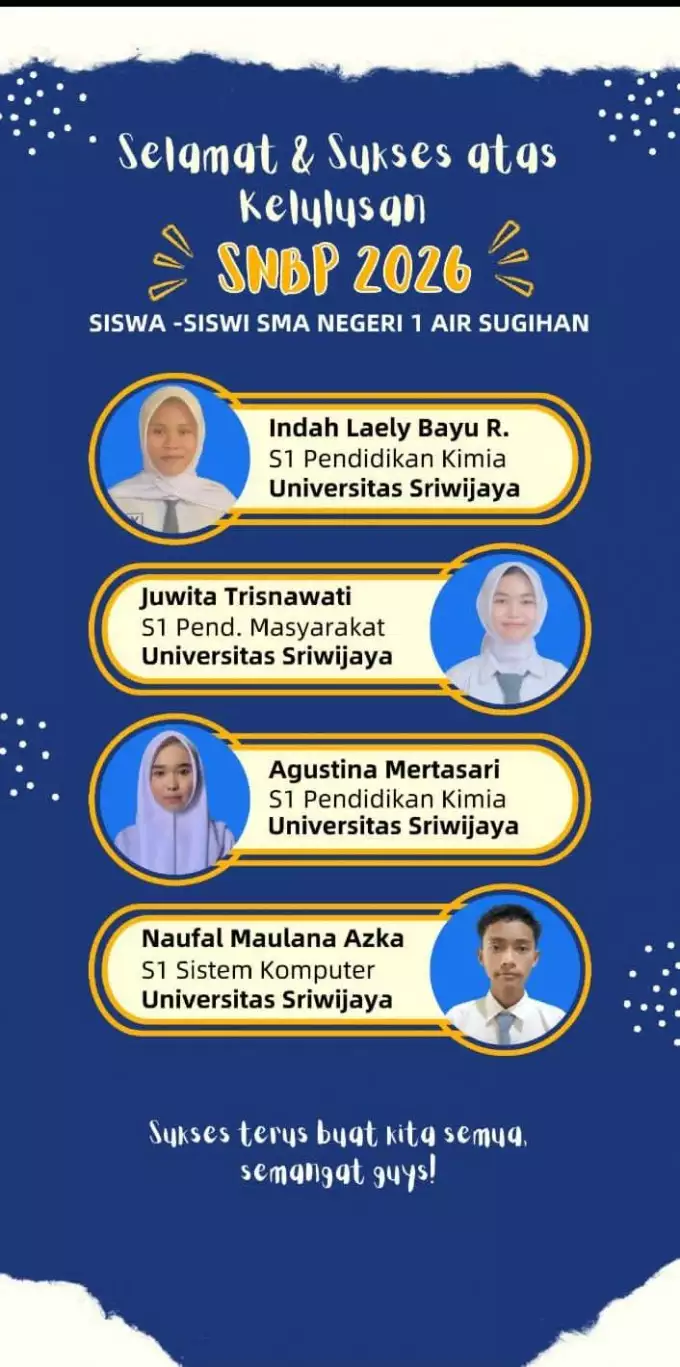 “Kami keluarga besar SMAN 1 Air Sugihan mengucapkan selamat dan sukses kepada empat siswa yang telah lulus SNBP 2026. Semoga keberhasilan ini menjadi motivasi bagi siswa lainnya untuk terus belajar dan meraih cita-cita,” ujarnya.