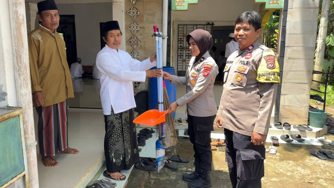 Dalam kegiatan tersebut, Polsek Kemang menyerahkan sejumlah alat kebersihan sebagai bentuk dukungan terhadap kebersihan dan kenyamanan rumah ibadah.