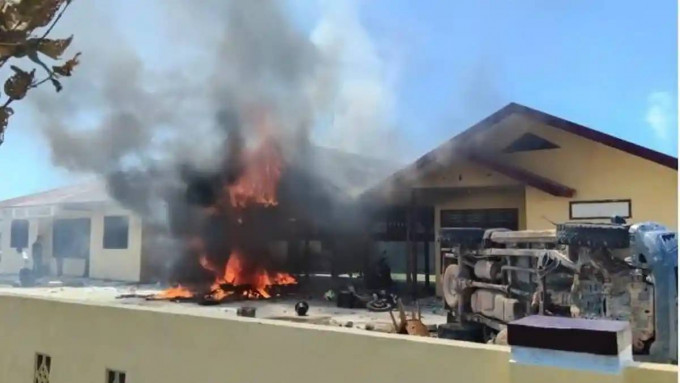 Foto: Kantor Polsek Muara Batang Gadis di Kabupaten Mandailing Natal (Madina) dibakar massa yang marah pada Sabtu (20/12/2025),