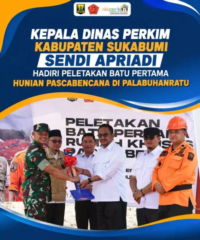 garudasaktinews.com - Sukabumi, Kepala Dinas Perumahan dan Permukiman (Perkim) Kabupaten Sukabumi, Sendi Apriadi, menghadiri kegiatan peletakan batu pertama pembangunan hunian pascabencana bagi warga terdampak pergerakan tanah di wilayah Palabuhanratu. Kegiatan tersebut dipimpin langsung oleh Bupati Sukabumi H. Asep Japar di kawasan Kampung Mubarakah, Desa Cikadu, Kecamatan Palabuhanratu, Rabu (1/4/2026).