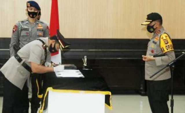 Kapolda Sumsel Irjen Pol Prof Dr Eko Indra Heri S, Memimpin jalannya Sertijab AKBP Erlin Tangjaya, S.H, S.I.K, sebagai Kapolres Musi Banyuasin (Muba) menggantikan AKBP Yudhi Surya Markus Pinem, S.I.K yang digelar diruang Gedung Promoter Polda Sumatera Selatan, Selasa (18/8/20).