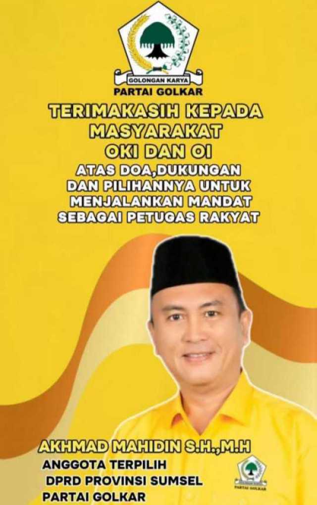 Pemilihan umum 2024, sudah selesai kini kita menunggu tahap pengumuman pemenang, Akhmad Mahidin SH, MH, caleg dari partai Golkar Dapil 3 daerah pemilihan OKI -OI, Akhmad Mahidin, SH, MH unggul mendapatkan 16,767 suara.