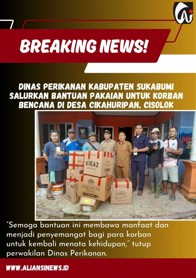 aliansinews.id - Sukabumi, Sebagai wujud kepedulian terhadap masyarakat yang terdampak bencana, Dinas Perikanan Kabupaten Sukabumi menyalurkan bantuan pakaian kepada warga korban bencana di Desa Cikahuripan, Kecamatan Cisolok, pada Senin (3/11/2025). Bantuan tersebut diserahkan langsung oleh jajaran pegawai Dinas Perikanan dan diterima oleh Kepala Desa Cikahuripan di Kantor Desa Cikahuripan.