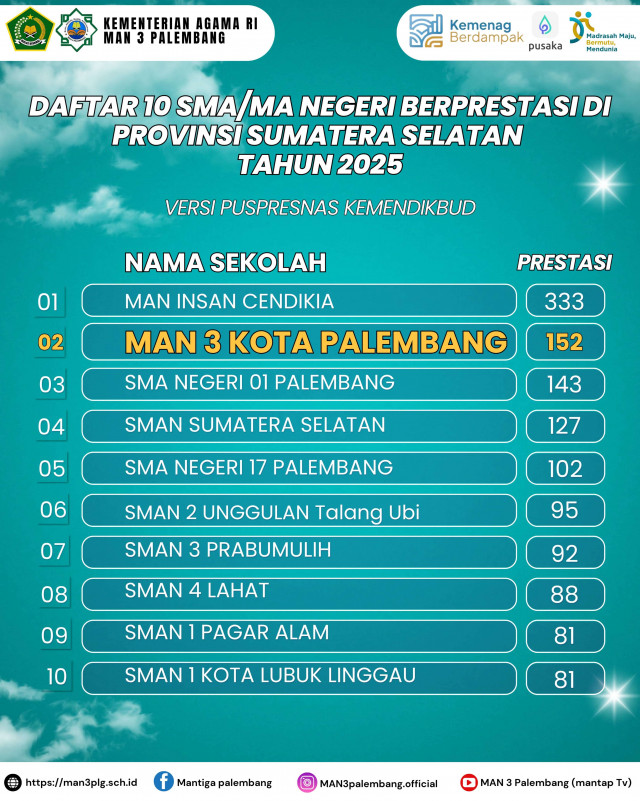 Dalam daftar tersebut, MAN 3 Palembang meraih skor 152 poin, hanya terpaut dari MAN Insan Cendikia yang menempati posisi pertama dengan 333 poin. Capaian ini menjadi bukti bahwa MAN 3 Palembang mampu bersaing dengan sekolah-sekolah unggulan di Sumatera Selatan, baik dari sisi akademik maupun non-akademik.