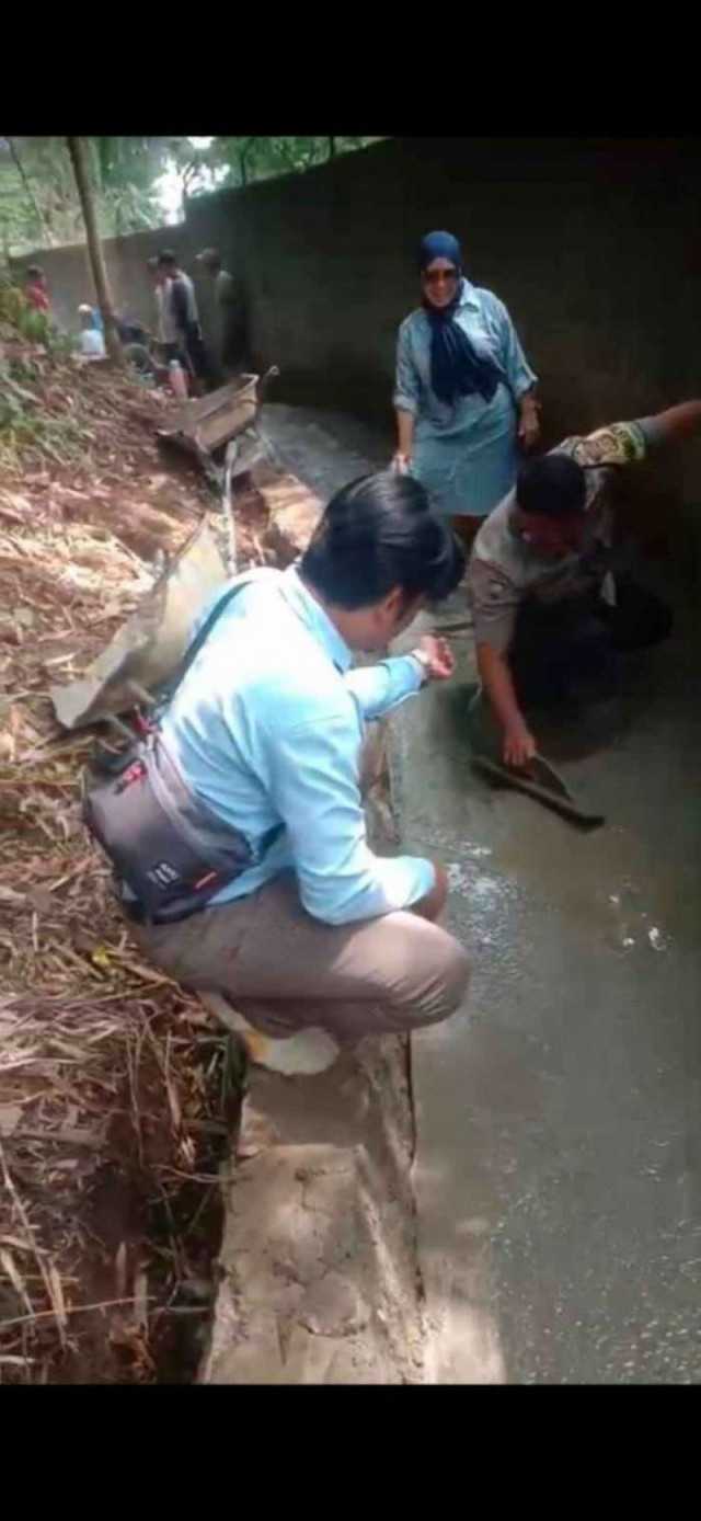 Polres Bogor - Aliansinews id. Bhabinkamtibmas Desa Sukamahi Bripka Tri sutrisno membantu pembangunan jalan kampung diwilayah (29/04/2025).