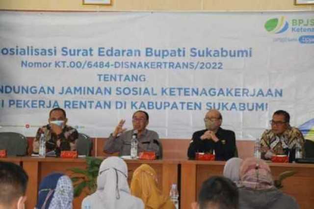 Hal itu ditegas Kepala BPJS Ketenaga kerjaan Oki Widiaganda bahwa pekerja rentan yaitu pekerja bukan penerima upah yang penghasilannya hanya cukup untuk membiayai kehidupan sehari-hari sehingga belum bisa memprioritaskan membayar iuran Jaminan Kecelakaan Kerja (JKK) dan Jaminan Kematian (JKM)."dengan adanya sosialisasi Surat edaran Bupati Sukabumi ini mudah mudahan para pekerja rentan dapat mendapatkan bantuan perlindungan dari pengusaha" jelasnya dalam sosialisasi yang dilaksanakan di Aula Dinas Sosial, Kamis (22/9/2022)