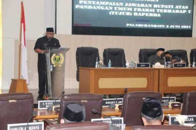 media.aliansiindonesia.id - Bupati Sukabumi H. Marwan Hamami menyampaikan jawaban atas pandangan umum fraksi DPRD mengenai Tujuh Rancangan Peraturan Daerah (Raperda) dalam rapat paripurna di Gedung DPRD Kabupaten Sukabumi. Rabu (2/6/2021).