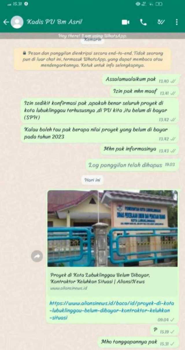 Kontraktor Keluhkan,Situasi sangat di sayangkan kepala Dinas Pekerjaan Umum dan Penataan Ruang Kota Lubuklinggau, Achmad Asril Asri, memblok no whatsapp