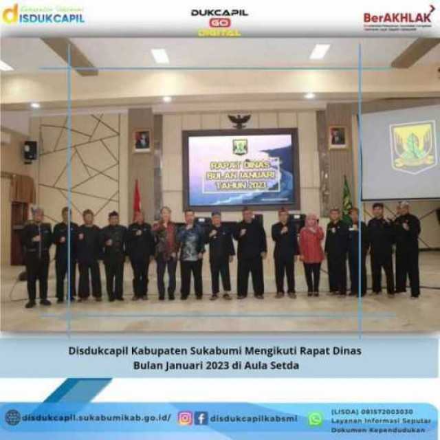aliansinews.id - Sukabumi, Disdukcapil Kabupaten Sukabumi melaksanakan Rapat Dinas Bulan Januari 2023 di aula setda. Kamis, 19 Januari 2023. Rapat Dinas yang dipimpin oleh Bupati Sukabumi H. marwan Hamami didampingi oleh Wakil Bupati Sukabumi H. Iyos Somantri dan dipandu oleh Sekretaris Daerah Kabupaten Sukabumi Ade Suryaman, SH., MM.