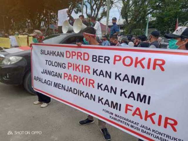 MUBA - Ratusan Massa Forum Masyarakat Jasa Konstruksi (FMJK) kabupaten Musi Banyuasin menggelar aksi damai di depan Kantor DPRD kabupaten Musi Banyuasin, Rabu (19/8/2020).