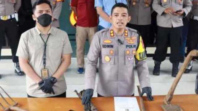Kepolisian menyita sejumlah barang bukti berupa cangkul, garpu, dan senapan angin yang digunakan untuk melakukan penganiayaan kepada korbannya.