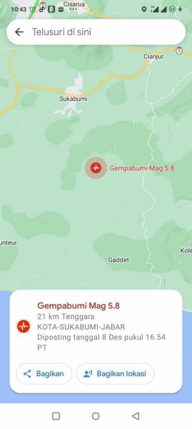 "Pusat gempa berada di darat, 22 kilometer tenggara Kota Sukabumi," kata postingan BMKG, dikutip RRI. "Kedalaman 104 kilometer."