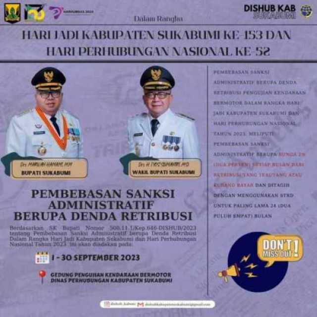 Hal tersebut Berdasarkan SK Bupati Nomor 500.11.1/kep.646-DISHUB/2023 tentang pembebasan sanksi administratif berupa denda retribusi dalam rangka hari jadi kabupaten sukabumi dan hari perhubungan nasional tahun 2023.