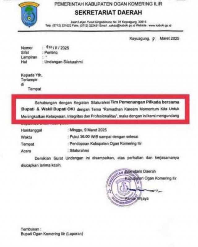 Surat Undangan Pemerintah Kabupaten Ogan Komering Ilir (Pemkab OKI) melalui Sekretariat Daerah Nomor: 420/II/2025 Perihal Undangan Silaturahmi tertanggal 7 Maret 2025 yang ditandatangani Sekretaris Daerah Kabupaten OKI, Asmar Wijaya membuat kontroversi dan mendapat kritikan dari Ketua DPD IWO Indonesia OKI.