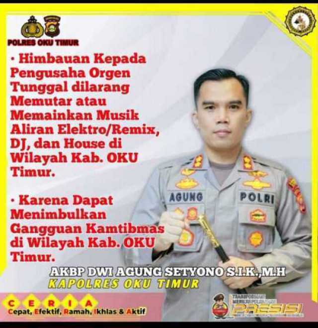 Aliansi indonesia - Kapolres OKU Timur AKBP Dwi Agung Setyono S.I.K.,M.H menghimbau Pengusaha Orgen Tunggal dilarang memutar atau memainkan musik aliran elektro/remix, DJ, dan house Di wilayah kabupaten OKU Timur. Selasa (17/1/2023)