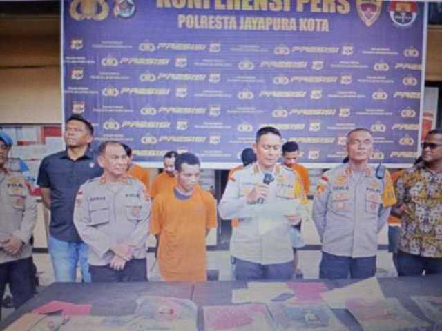 Konferensi Pers tersebut berlangsung di Mapolresta Jayapura Kota, dimana Kapolresta didampingi Wakapolresta AKBP Deni Herdiana, S.E., S.H., M.M., M.H, Kasat Reskrim Kompol Agus F. Pombos, S.I.K., M.H dan Kasi Humas AKP Muh. Anwar, Jumat (17/5) siang.