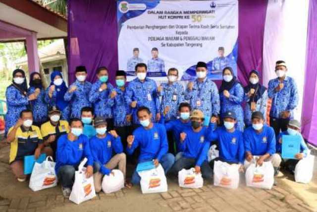 Dalam rangka puncak peringatan HUT emas yang ke-50, Korpri Kabupaten Tangerang berbagi rasa dengan para penjaga dan penggali makam Covid-19. Selain memberikan piagam penghargaan, Korpri pun memberikan sembako dan uang kadeudeh bagi mereka yang telah berjibaku memberikan pelayanan prima memakamkan masyarakat Kabupaten Tangerang yang meninggal akibat Covid-19.