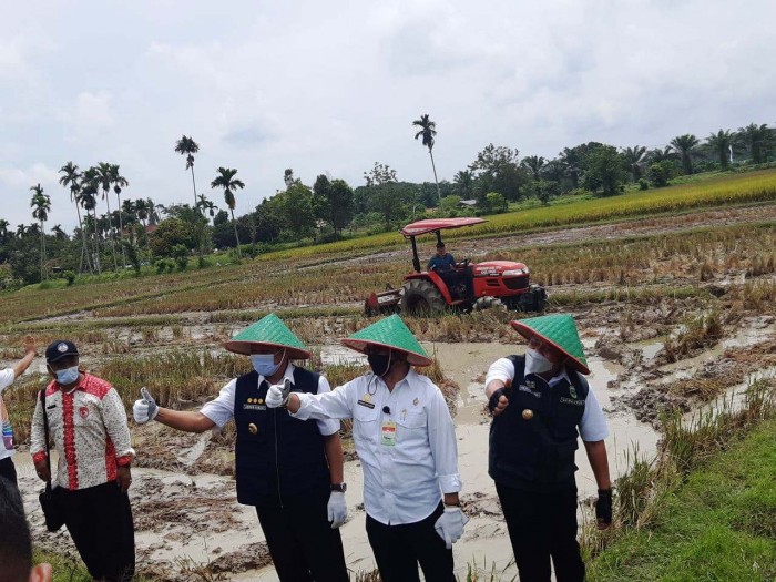 OKU TIMUR. Media AI - Menteri Pertanian RI Syahrul Yasin Limpo didampingi Gubernur Sumatera Selatan H. Herman Deru dan Bupati OKU Timur H. Lanosin beserta Wakil Bupati  H. M. Adi Nugraha Purna Yudha, S.H hadiri panen raya padi IP 200 di Desa Srikaton Kec. Buay Madang Timur Kabupaten OKU Timur. Kegiatan tersebut dihadiri juga oleh Dirjen Pertanian Pusat, para Bupati kabupaten tetangga, Forkopimda Provinsi dan kabupaten, Kejari, Polres, Kodim, dan seluruh unsur organisasi pertanian se OKU Timur. Sabtu (3/4/21)