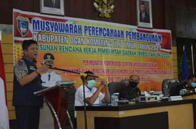 OKU TIMUR. Media AI - Pemerintah Kabupaten OKU Timur menggelar Musyawarah Perencanaan Pembangunan (Musrenbang) tahun 2021 dalam rangka Penyusunan Rencana Kerja Pemerintah Daerah (RKPD) tahun 2022 dengan Tema Peningkatan kontribusi sektor unggulan daerah, didukung oleh infrastruktur ekonomi dan profesionalisme aparatur menuju OKU Timur Maju Lebih Mulia. Musrenbang RKPD tahun 2022 dihadiri oleh Bupati OKU Timur H. Lanosin, S.T, Wakil Bupati OKU Timur H.M Adi Nugraha Purna Yudha, S.H, Kajari OKU Timur Dr. Akmal Kodrat, S.H, M.Hum, Dandim 0403 OKU atau yang mewakili, Ketua DPRD OKU Timur H. Beny Dafitson, S.IP, M.M, Kapolres OKU Timur yang di wakili oleh Wakapolres OKU Timur KOMPOL Erwinsyah Manik, S.I.K, Danpuslatpur Martapura atau yang mewakili, Direktur RSUD OKU Timur dr. Sugihartono, M.Sc, Dan Yon Armed Martapura Letkol Arm. Anggeng Prasetyo, S.SE, Kepala Bapeda Sumatera Selatan Dr. Ir H. Firmansyah M.Si, Kepala Bapeda OKU Timur Maryus Markus Firdaus, S.ST,Kepala Kantor Kementrian Agama OKU Timur Dr.H.Abdul Rosyid,S.Ag.,M.M.,M.Si. serta Ketua Lembaga Aliansi Indonesia M. Kanda Budi Setiawan, S.Pd.I, di ruang Bina Praja I. Kamis (18/3/21).