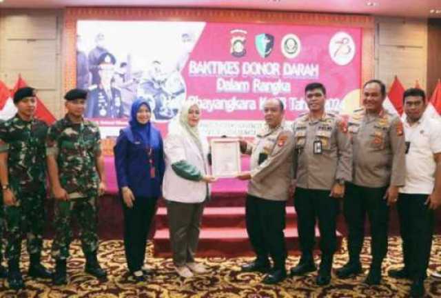 Aliansi Indonesia - Polda Sumsel menggelar bhakti kesehatan berupa donor darah sempena hari ulang tahun Bhayangkara ke-78, di auditorium lantai VII gedung Presisi Mapolda Sumsel, Rabu (12/06/24).