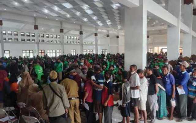 Foto: Suasana anteran pembagian BLT untuk driver ojol dan pelaku transportasi lain di Gedung Sasana Manggala Sukowati (SMS), Senin (12/12).