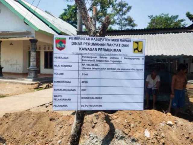Pembangunan saluran drainase /gorong gorong dikelurahan B srikaton kecamatan tugumulyo ,dengan anggaran Rp 189.200.000 melalui APBD dikerjakan oleh CV Putri Cahyani ,yang diduga mengurangi Volume
