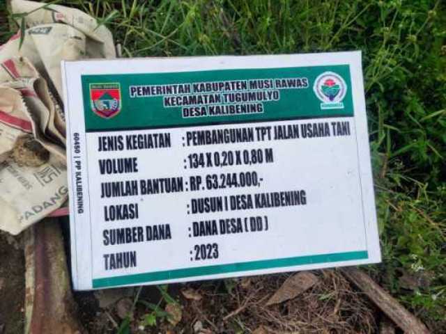 Pembangunan Tembok penahan tanah untuk jalan usaha tani yang terletak didesa Kali Bening kecamatan tugumulyo kabupaten Musi rawas Provinsi Sumatera selatan tepatnya di dusun 1,pada tahun 2023 dengan anggaran mengunakan dana desa dengan nilai Rp 63.244.000 ,dimana di dalam sistem pembangunan diduga tidak mematuhi aturan padat karya tunai