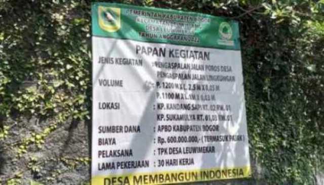 Di desa Leuwimekar, anggaran tahun, 2022 yang 40% Rp 400,000,000. (Empat ratus juta rupiah) di pokuskan pada pekerjaan Hotmik ( JALING ) jalan lingkungan, tepatnya di Kp Kandang sapi RT 002/001. Kp Suka mulya RT 001-003/001. Volume P 11000 M. X L 1 M. X T. 0,03, M. lama perjalanan 30 Hari kerja.