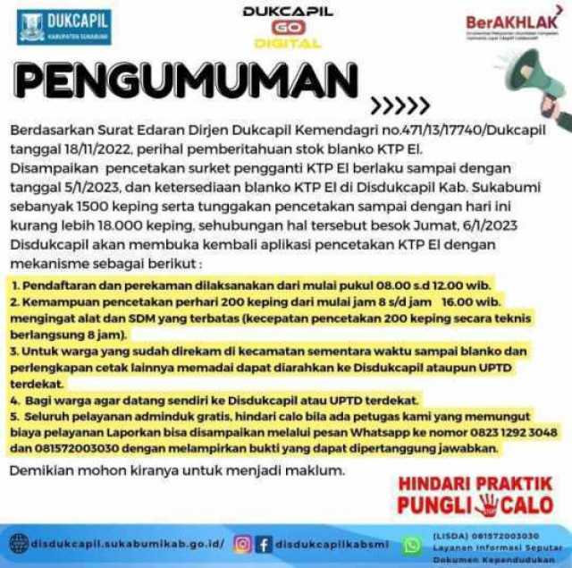 aliansinews.id - Sukabumi, Berdasarkan SE Dirjen Dukcapil Kemendagri no.471/13/17740/Dukcapil tanggal 18/11/2022 perihal pemberitahuan stok blanko KTP EL, disampaikan pencetakan surket pengganti KTP El berlaku sampai dengan tanggal 5/1/2023 dan ketersediaan blanko KTP El di Disdukcapil Kab. Sukabumi sebanyak 1500 keping serta tunggakan pencetakan sampai dengan hari ini kurang lebih 18.000 keping, sehubungan hal tersebut besok Jumat 6/1/2023 Disdukcapil akan membuka kembali aplikasi pencetakan KTP el dgn mekanisme sebagai berikut :