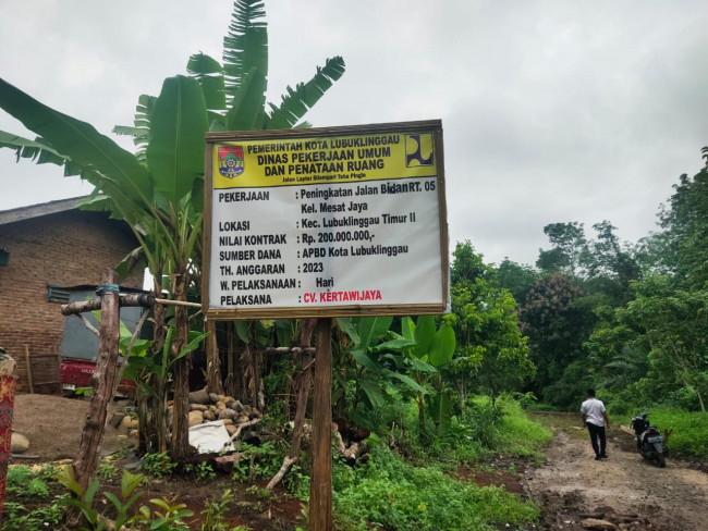 Pembangunan peningkatan jalan bidan Rt 05 kelurahan mesat jaya kecamatan lubuk linggau timur 2 dengan anggaran Rp 200.000.000 dikerjakan oleh CV Kertawi Jaya ,tahun 2023 ,kualitasnya diragukan terkesan tidak ada pembersihan dan pemadatan