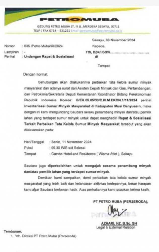 Menanggapi surat undangan rapat dan sosialisasi Petro Muba No:035/Petro-Muba/XI/2204, yang mengundang seluruh penambang minyak dan/atau pemilik lahan yang terdapat sumur minyak di kabupaten Musi Banyuasin.