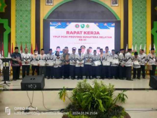 Persatuan Guru Republik Indonesia (PGRI) Sumatera Selatan (Sumsel) gelar Rapat Kerja (Raker) ke-41 secara redmi dibuka oleh Pj Gubernur Sumsel diwakili Kadis Pendidikan Provinsi Sumsel, Drs. H. Sutoko, MSi., di Asrama Haji Jalan Tanjung Api-Api Kebun Bunga Kecamatan Sukarami Kota Palembang, Rabu (24/1/2024).