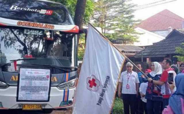 Ketua Palang Merah Indonesia (PMI) provinsi Sumatera Selatan, Hj. Febrita Lustisia Herman Deru melepas peserta penerima penganugerahan Satyalenca kebaktian sosial Donor Darah Sukarela (DDS) 100x tahun 2024 yang akan diberangkatkan ke Jakarta dari markas PMI provinsi Sumsel, Minggu pagi (04/07/2024).