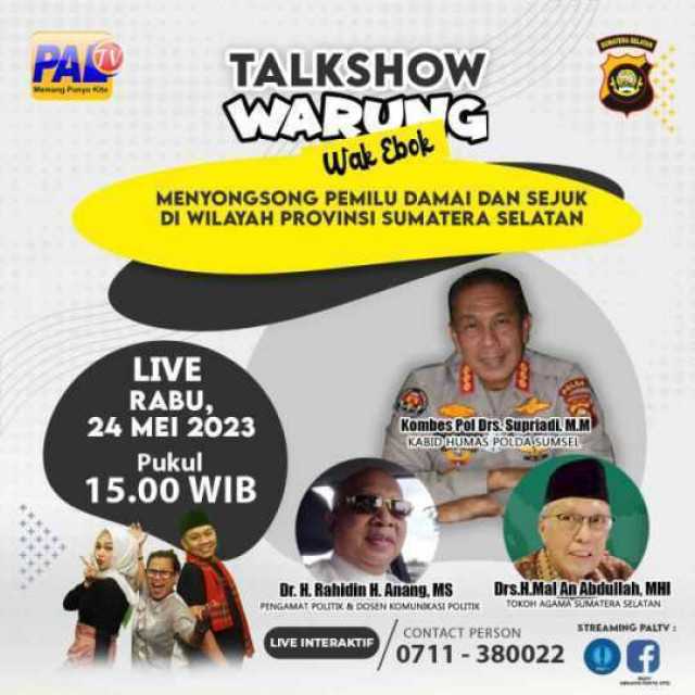 Hal ini dikatakan Kapolda Sumsel, Irjen Pol A Rachmad Wibowo SIK melalui Kabid Humas, Kombes Pol Drs Supriadi MM saat menjadi tamu di talkshow warung Wak ebot, Rabu (24/5/2023)