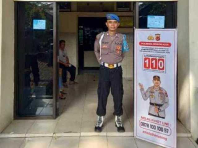 Terlihat Aipda Diki Irawan, Propam Polsek Bogor Barat mensosialisasikan kepada masyarakat yang datang ke Polsek Bogor Barat tentang no aduan Kapolresta tersebut