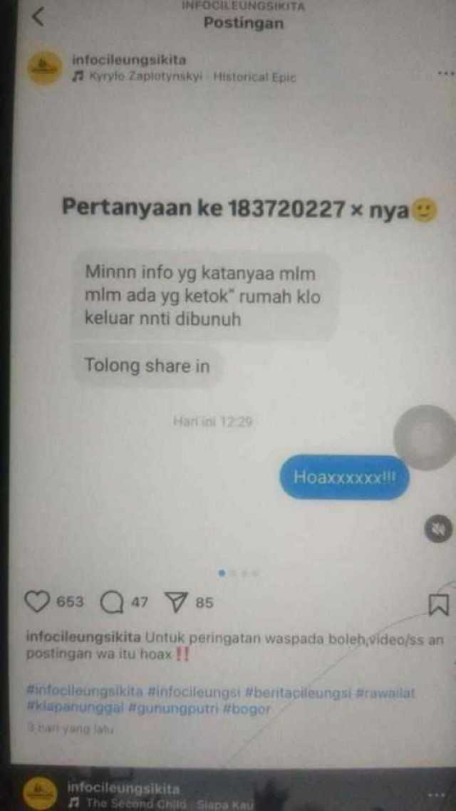 Kami dari pihak Kepolisian menghimbau kepada seluruh Lapisan masyarakat untuk bijak dalam menggunakan medsos apapun dan jangan mudah percaya dan terprovokasi akan adanya berita berita yang memang belum tentu benar kebenarannya, dan kami berharap penuh bantuan dari elemen warga masyarakat apabila menemukan hal hal yang dapat mengganggu kamtibmas agar segera menghubungi pihak Kepolsian baik tingkat Polsek terdekat ataupun langsung datang Ke Polres Bogor, dan bisa mengubungi Di Call Center kami melayani 24 Jam nomor pengaduan di 021 110 akan segera ditindak lanjuti.