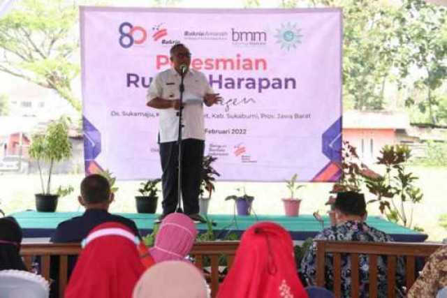 Sukabumi, Bupati Sukabumi H. Marwan Hamami meresmikan Rumah Harapan Untuk Negeri di Desa Sukamaju, Kecamatan Kadudampit, Rabu, 23 Februari 2022. Prosesi peresmian, diawali dengan peninjauan 10 rumah yang dibangun hasil kerjasama Yayasan Bakrie Amanah, Baitulmaal Muamalat, dan Muhammadiyah. Selain itu, dilakukan pula penebaran benih ikan untuk dibudidayakan para penerima manfaat rumah harapan untuk negeri.