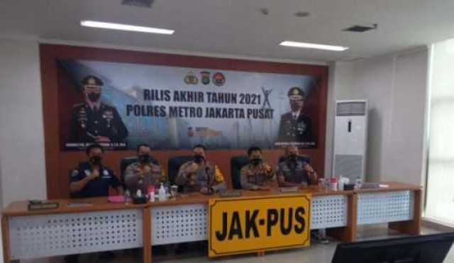 Polres Metro Jakarta Pusat menggelar Konferensi Pers akhir Tahun di Aula Lt. 3 Polres Jakpus terkait situasi Kamtibmas dan capaian yang telah dilakukan sepanjang tahun 2021 pada Jumat (31/12/21).