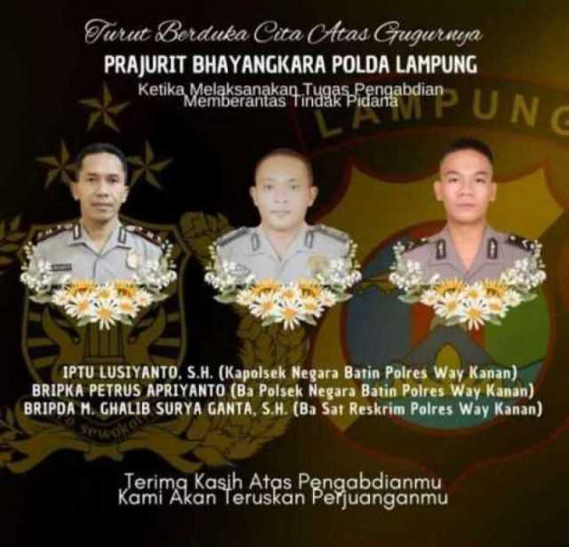 Ucapan dukacita itu disampaikan humas Polda Lampung melalui akun Instagramnya. Disebutkan ketiga anggota yang gugur adalah Kapolsek Negara Batin Iptu Lusiyanto, BA Polsek Negara Batin Bripka Petrus Apriyanto, dan BA Sat Reskrim Polres Way Kanan Bripda M Ghhalib Ganta.