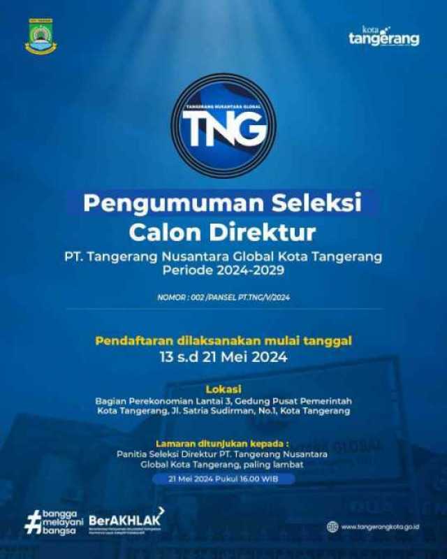 PT Tangerang Nusantara Global (TNG) mengumumkan akan melakukan seleksi terbuka Calon Direktur PT TNG Kota Tangerang periode 2024-2029. Pendaftaran dibuka mulai 13 Mei hingga 21 Mei 2024 hingga pukul 16.00 WIB.