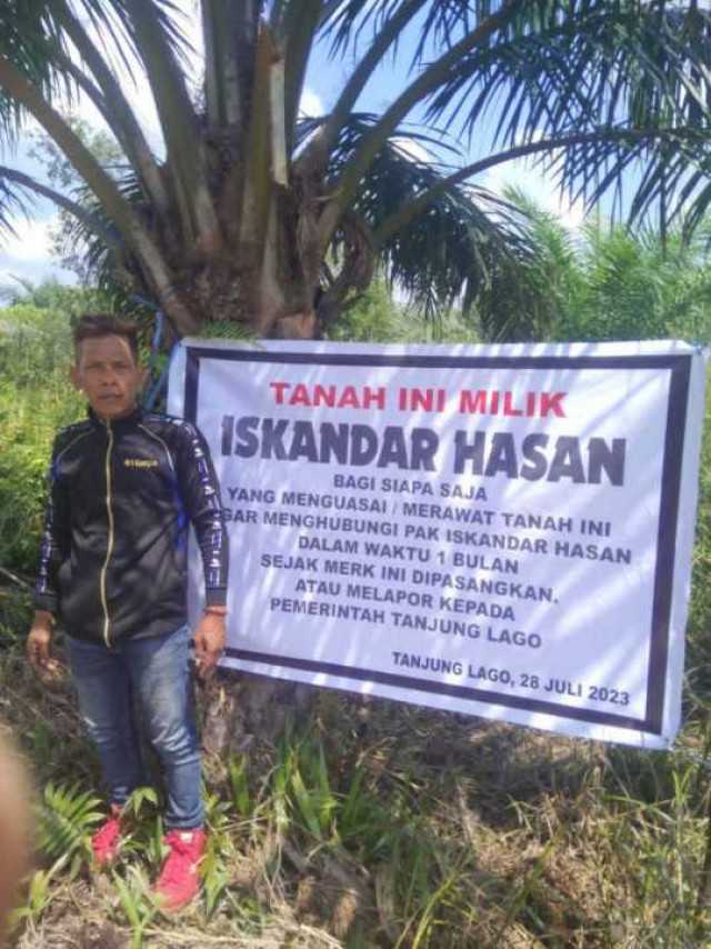 “Sudah dipasangkan spanduk atau plang yang berbunyi tanah ini milik Iskandar Hasan, bagi siapa saja yang menguasai atau merawat tanah ini, agar menghubungi pak Iskandar Hasan. Dalam waktu satu bulan sejak merk ini dipasangkan 28 Juli 2023, atau melapor kepada Pemerintah Tanjung Lago”, ungkap Nazarudin, kepada media online Aliansinews, Rabu (02/08/23). (Sya)