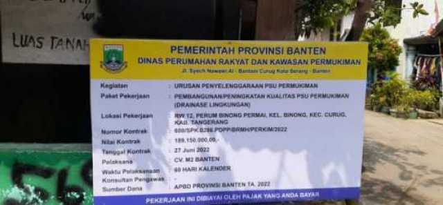 Diketahui Proyek Pembangunan Peningkatan kwalitas PSU Pemukiman atau Drainase Lingkungan dengan nomor kontrak 600/SPK.0286.PDPP/BRHM/Perkim/2022 dengan pagu anggaran 189.150.000 dari APBD Provinsi Banten TA.2022, dengan Pelaksanaan CV.M2 Banten di area RW 12 Perum Binong Permai, Kelurahan Binong kecamatan Curug kabupaten Tangerang di duga tak sesuai Kerangka Kerja dikatakan Kadiv pemantau dan penindakan BP2 TipikorAliansi Sahatma Sinaga kepada awak media, Jum'at (5/8/2022).