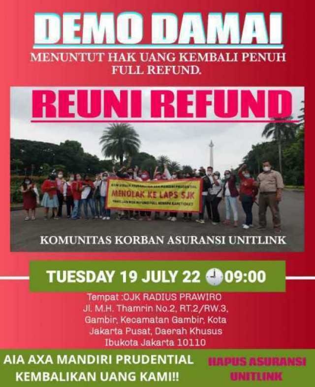 Koordinator Ibu Maria Tri Hartati mengundang seluruh korban asuransi dari Prudential, AXA, AIA untuk menghadiri aksi damai di Gedung OJK Radius Prawiro mulai pukul 08.00 s/d selesai, Selasa 19/07/2022.