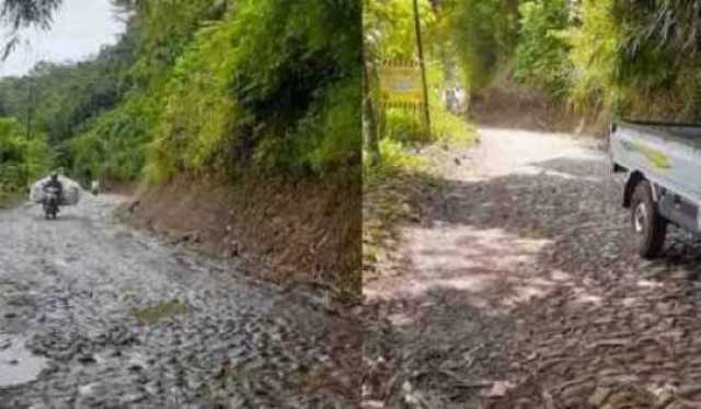 Jalan Kabupaten ini selain rusak juga dipenuhi bebatuan kecil. Sehingga ketika terjadi hujan, pengendara motor musti hati-hati karena jalan akan becek dan licin.